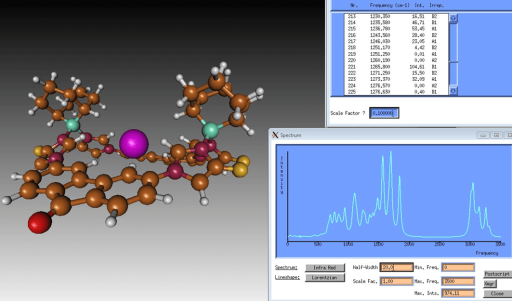 Figure 1 : Structure 3D (gauche) et spectre infra-rouge (droite) d’un chélate modèle de 211At.