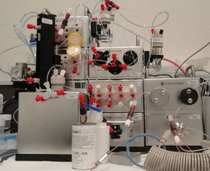 - Le travail concerne la production du 44mSc/44Sc : ciblerie, extraction et purification, étude de l’effet de l’énergie de recul et du «post-effect» sur le complexe 44mSc-DOTA dans le but de concevoir un générateur in vivo de 44mSc/44Sc. Nos travaux ont mis en évidence que la meilleure cavité chélatante du scandium est le DOTA. Aussi, le radiomarquage du DOTA avec le couple 44mSc/44Sc a été optimisé à travers une étude physico-chimique systématique (cinétique, pH, température, rapport métal-ligand). La transition 44mSc / 44Sc ne conduit pas à un décrochage du scandium vers la phase aqueuse. Des peptides conjugués au DOTA (DOTATOC, DOTATATE, IMP-288 …) ont été étudiés. Les constantes d’interaction entre les protéines et le scandium doit être déterminées afin de pouvoir prédire leur spéciation in vivo. Un couplage CE-ICP-MS a été développé et testé avec succès pour les actinides trivalents et des ligands polyamicopolycaroxyliques. L’étude de ces peptides permet également d’obtenir une réponse biologique (biodistribution, premières images TEP…) sur la faisabilité du générateur. Enfin, le développement de cibles de scandium de plus haute activité est indispensable. Il nous permet dans un premier temps, de valider le concept de générateur in vivo, en étudiant la chimie sous rayonnement lors des différentes étapes d’extraction et de purification (notamment sur les résines échangeuses). De plus hautes activités rendent possibles les injections chez le petit animal (images TEP et biodistributions) et les études pré-cliniques pour ce nouveau radiopharmaceutique.