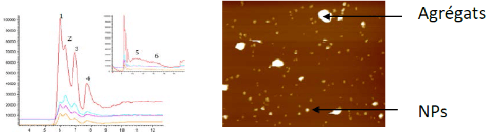 Des nano-hydrogels à base de biopolymères, pour l’encapsulation de chélates de Gadolinium ont été synthétisés par l’Université de Reims. Ces nano-hydrogels permettent d’exalter les propriétés de contraste en IRM de ces chélates. Ces nanogels sont actuellement exploités dans le cadre d’un projet Euronanomed (Gadolymph) dans un but d’imagerie du système lymphatique. Ceci implique de contrôler tant que possible la taille des nanogels et de la restreindre en dessous des 100 nm. La technique de caractérisation usuelle des nanogels (DLS) semble surestimer leur taille, comme cela a pu l’être montré par des mesures de microscopie AFM en mode liquide par les équipes travaillant sur cette thématique au sein de l’Université de Reims. Les travaux développés depuis quelques années sur les nanoparticules ont permis d’acquérir une expertise en matière de caractérisation de macromolécules et nanoparticules par la technique AF4 couplée à une détection MALS. Le couplage AF4/MALS permet de trier les objets selon leur taille, en amont de leur détection par mesure de l’intensité de leur lumière diffusée sous différents angles incidents. Cette méthodologie est donc particulièrement bien adaptée à la caractérisation de nano-objets (liposomes, nanoparticules inorganiques par ex.). Elle a demandé une mise au point dans le cas de nanogels. Ainsi, une collaboration avec l’Université de Reims a permis de compléter la caractérisation actuelle des nanohydrogels (DLS, AFM liquide) par AF4/MALS de façon i) à mettre en place une approche d’étude morphologique multi techniques, pour ii) estimer au mieux la taille des nanoparticules avant leur injection chez l’animal, et iii) discriminer parmi toutes les formulations existantes les plus adéquates en termes de taille.