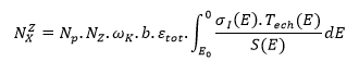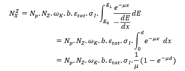 où E0 est l’énergie initiale, Np le nombre de particules incidentes, ωK le rendement de fluorescence, b l’intensité de la raie X, σI la section efficace d’ionisation de la couche, NZ le nombre d’atomes cibles par unité de volume, εtot l’efficacité de détection, Tech est un facteur de transmission tenant compte de l’auto absorption dans l’échantillon et S(E) le pouvoir d’arrêt de la cible.