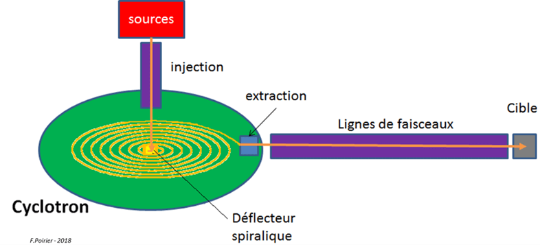 Les particules sont alors accélérées à l’intérieur de la chambre à vide du cyclotron par le champ électrique RF régnant entre les Dees. Les particules sont gardées sous une trajectoire circulaire par le champ magnétique perpendiculaire au plan du cyclotron, dont la valeur maximale est de 1,64 T. Du fait de la constante augmentation en énergie cinétique des particules, la trajectoire globale est celle d’une spirale et ceci jusqu’à l’éjection des particules hors du cyclotron.